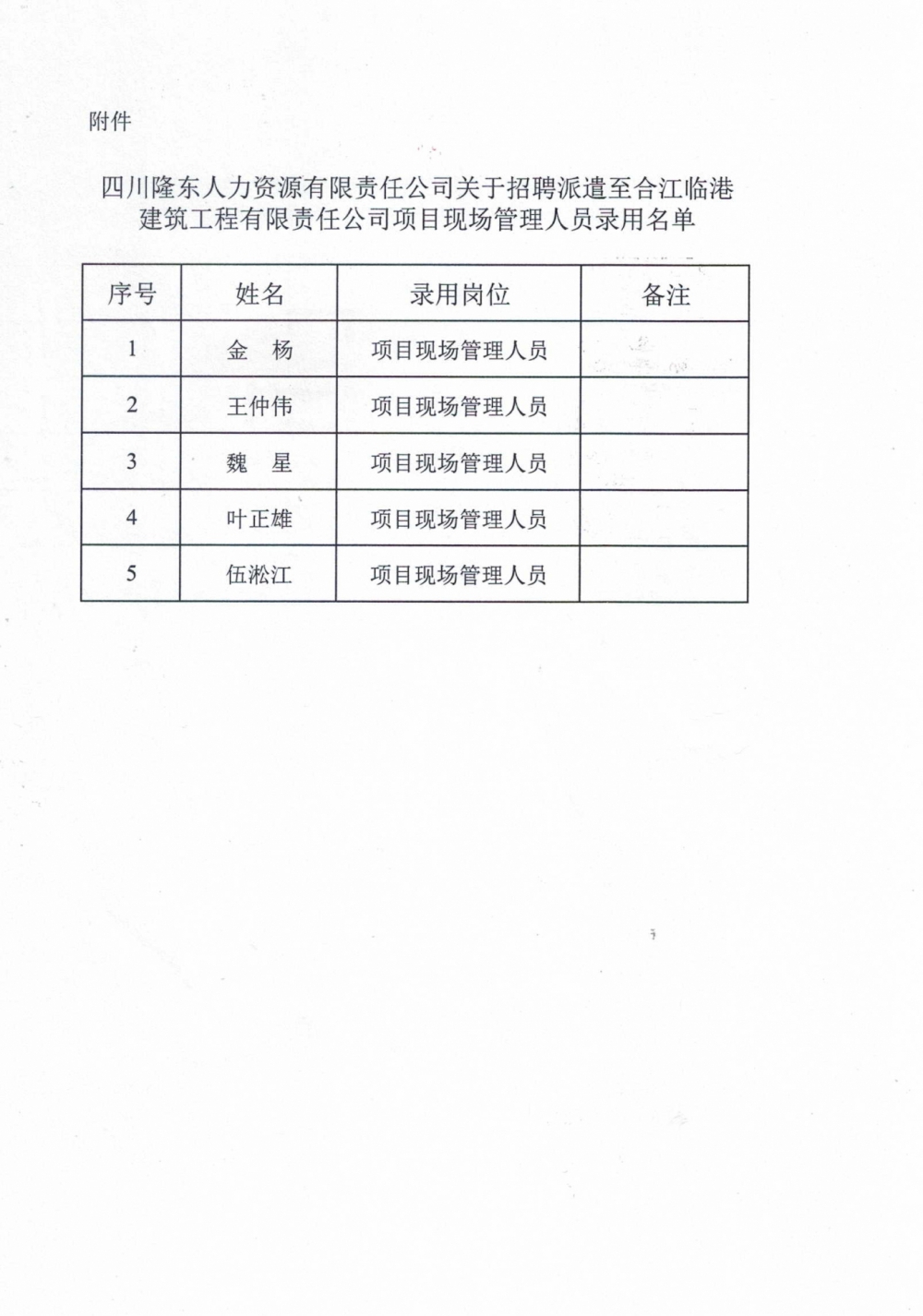 關(guān)于招聘派遣至合江臨港建筑工程有限責(zé)任公司項(xiàng)目現(xiàn)場(chǎng)管理人員錄用的公示